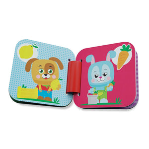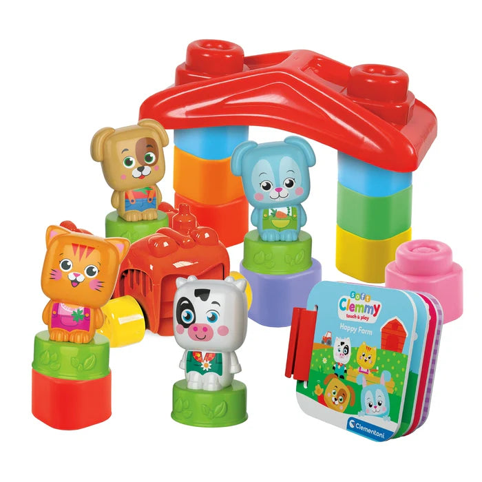 Tanti mattoncini colorati, un trattore e una casetta per rivivere le avventure illustrate nel pratico libro della Clemmy baby happy farm.