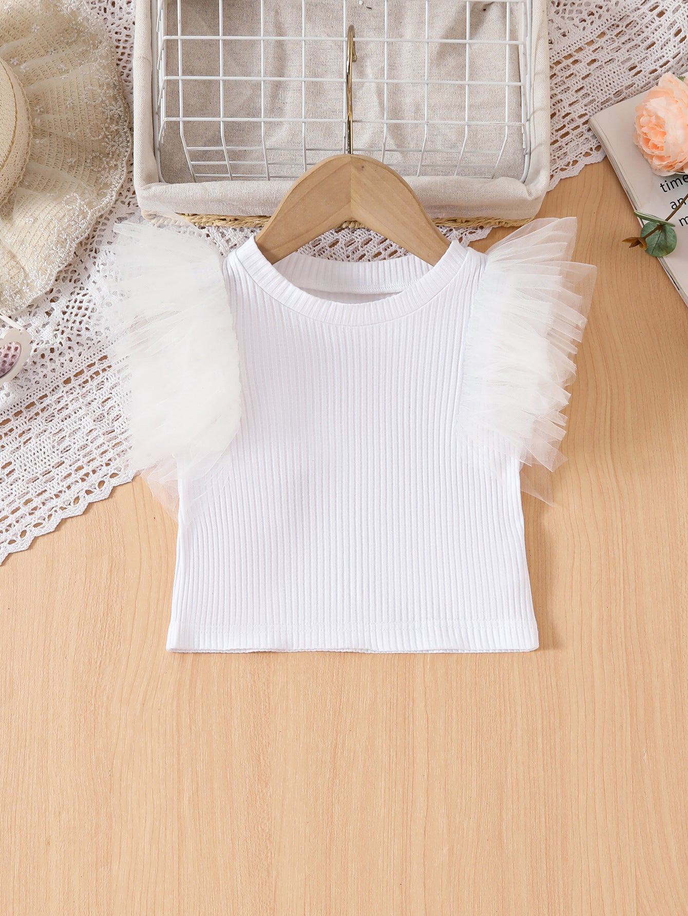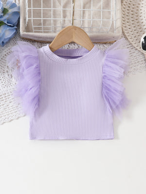 Un top semplice ma dal grande effetto! Questo modello da bambina in morbido cotone a costine è impreziosito da maniche a sbuffo in tulle, perfette per un look romantico e stiloso. Disponibile in tre varianti di colore: rosa confetto, bianco puro e lilla pastello, è l’ideale da abbinare a gonne, pantaloncini o jeans per creare outfit sempre nuovi. Comodo da indossare e fresco sulla pelle, è perfetto per la primavera e l’estate.