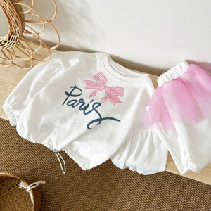 Dallo stile romantico e moderno, questo adorabile completo da bambina è composto da una felpa bianca con stampa “Paris” e fiocco rosa e da un pantalone con gonna in tulle integrata, per un look raffinato ma comodo. Ideale per occasioni speciali, passeggiate in città o shooting fotografici.