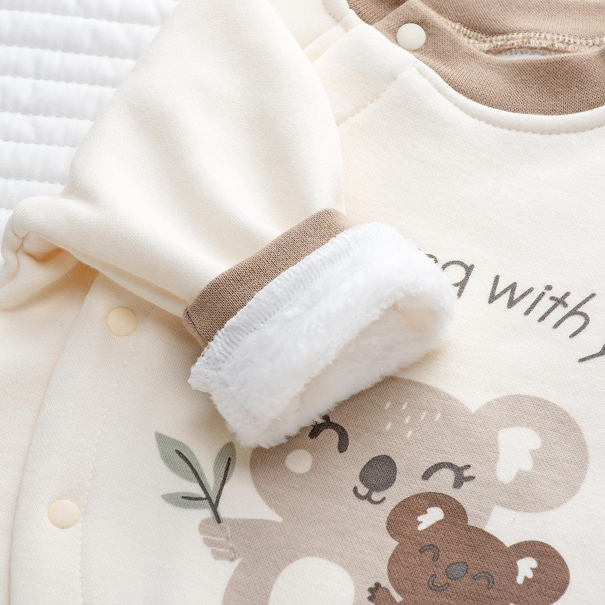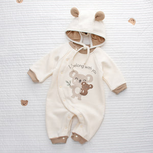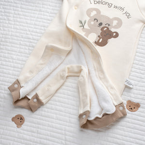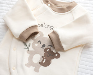 Delicata, calda e irresistibilmente tenera: questa tutina invernale per neonato è perfetta per le giornate più fresche! Realizzata in morbido cotone felpato color panna con dettagli beige, è impreziosita da una dolce stampa con koala e la scritta "I belong with you", simbolo di affetto e protezione.