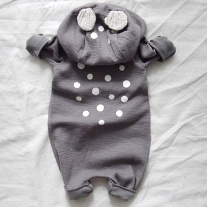Un concentrato di dolcezza per i più piccoli! Questa tutina invernale con cappuccio è realizzata in morbido cotone a costine, ideale per le stagioni fredde. Il retro è decorato con una simpatica stampa a pois in stile cerbiatto, mentre il cappuccio è arricchito da buffe orecchie in tessuto rigato. Disponibile in due calde tonalità: marrone e grigio antracite.