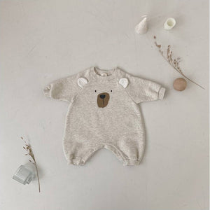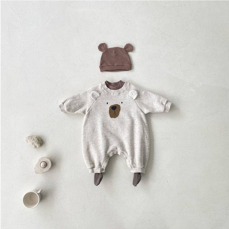 Un dolcissimo completo per coccolare il tuo bimbo! Questa tutina in morbido cotone felpato color grigio chiaro è decorata con un simpatico musetto d’orso e orecchiette applicate sulle spalle. Inclusa nel set anche una cuffietta marrone con orecchie, per un look tenero e divertente. Chiusura con bottoncini sul fondo per un cambio rapido e pratico.
