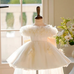 Abito Cerimonia Bambina Avorio con Strascico e Fiori in Tulle