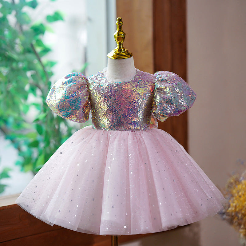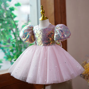 Abito da Cerimonia Bimba con Paillettes Iridescenti e Tulle Rosa