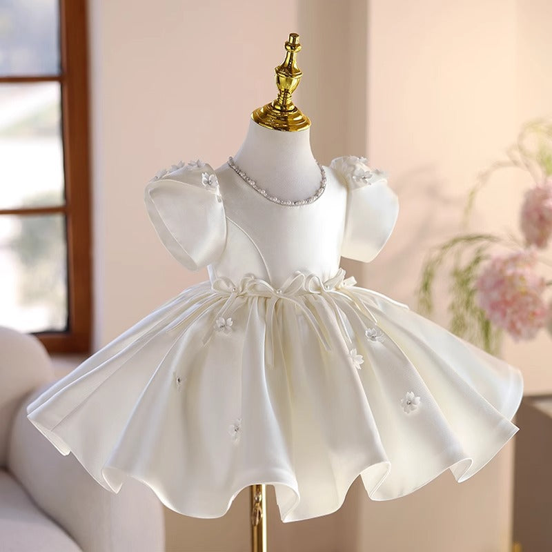 Abito Elegante Bambina Avorio con Maniche a Palloncino e Dettagli Floreali