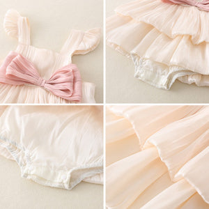 Un sogno di dolcezza per la tua principessa! Questo incantevole vestitino per neonata è composto da una gonnellina a balze in tessuto satinato, spalline con volant e un elegante maxi fiocco rosa cipria applicato sul davanti.