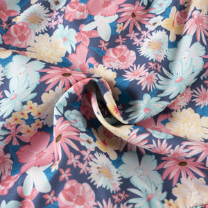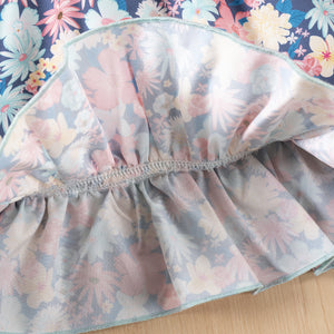 Un abito che profuma di primavera! Questo vestitino estivo da bambina è realizzato in tessuto leggero con una vivace fantasia floreale nei toni del rosa, azzurro e crema su fondo blu. Il taglio svasato con spalline sottili e volant sul fondo lo rende comodo e super carino per ogni occasione, dalle passeggiate al parco alle giornate di festa.